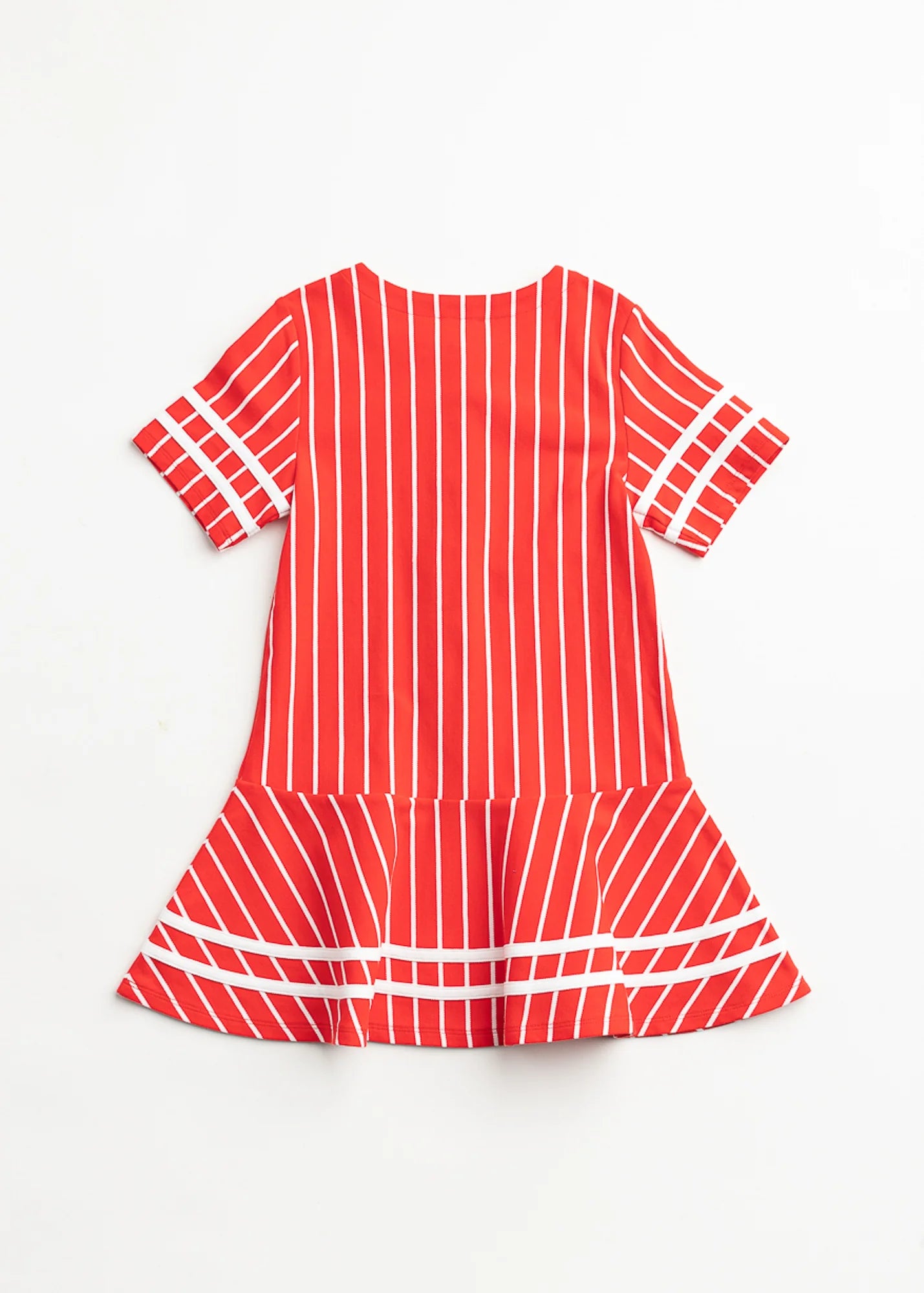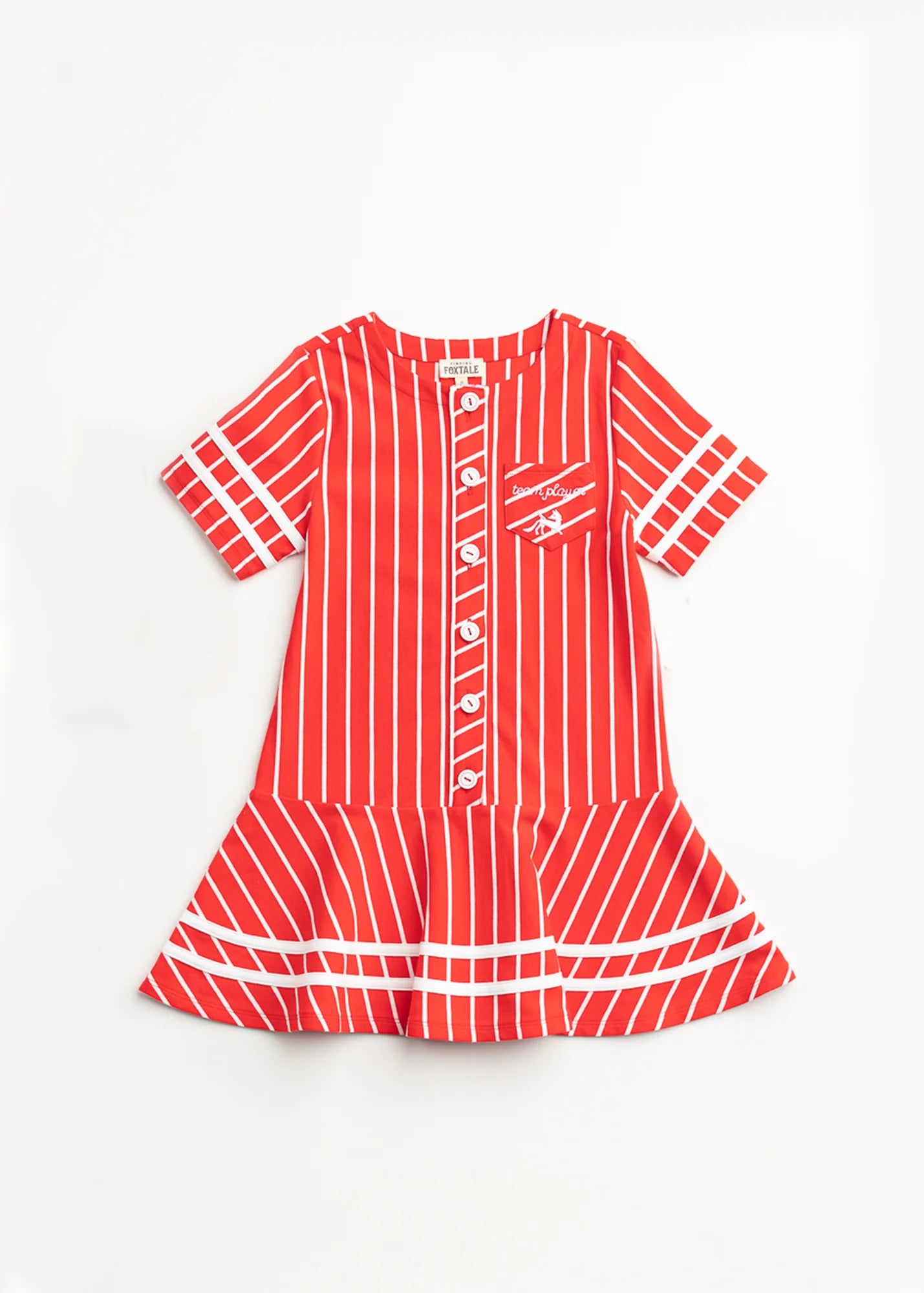An all-star adventure depends on an all-star team! That’s why the Team Player Dress cheers you on with a winning combination of red-and-white striped piqué! This all-knit, drop-waist style featuring white-striped appliqué detail, dotted buttons with a contrast floral interior button placket, and a proud embroidery of “team player” on the pointed pocket will be the MVP of your wardrobe all season long. For a primary pairing, add the Lemon Leggings, or for a full team color ensemble, pair with the Somersault Shorts.